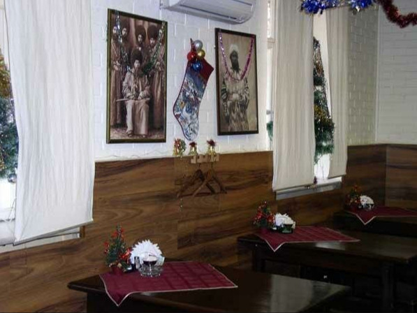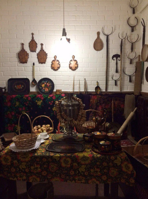 Интерьер кафе-музея выполнен в народном стиле и декорирован экспонатами быта и утвари. Большой самовар, часы с боем, расписные подносы, плетеные корзины и лапти, яркие платки и ковры, ажурные салфетки и скатерти - все это создает впечатление настоящей русской избы.