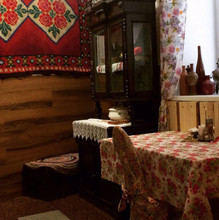 Интерьер кафе-музея выполнен в народном стиле и декорирован экспонатами быта и утвари. Большой самовар, часы с боем, расписные подносы, плетеные корзины и лапти, яркие платки и ковры, ажурные салфетки и скатерти - все это создает впечатление настоящей русской избы.
